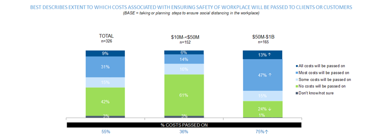 Smaller middle market companies lagged behind larger midsize businesses in transitioning people to remote work. In fact, 24% of companies polled with between $10 million-$50 million in revenue had no employees working remotely, compared to less than 5% of respondents with between $50 million-$1 billion in revenue. While in some instances this may have hindered the productivity of smaller companies during lockdown periods, the cohort may have the leg up in returning to the workplace.