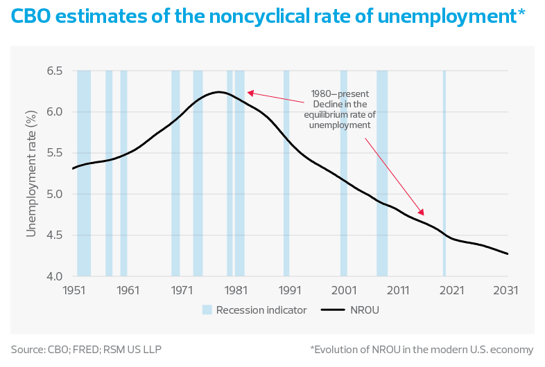 Formal estimates by the Congressional Budget Office of the noncyclical rate of unemployment—the rate of unemployment caused by all factors other than the business cycle—peaked at 6% in 1979, dropping to 4.5% in the third quarter of last year. Expectations are for that slow decline to continue over the next decade.
