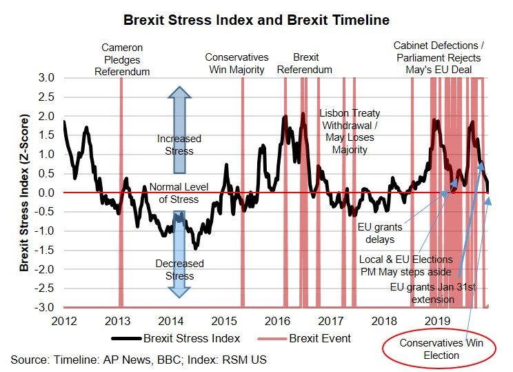 The RSM Brexit Stress Index is made up of six components; they include the British pound-euro exchange rate and its volatility, the FTSE 100 and its volatility, the gilt yield spread and the British corporate bond spread.
