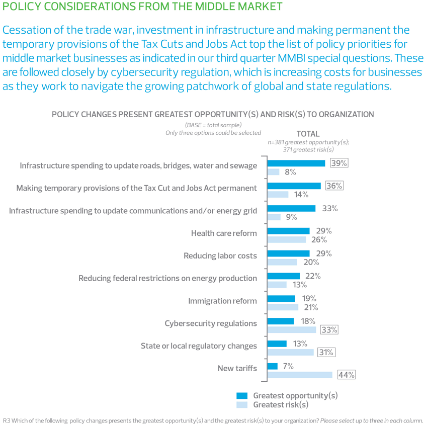 “While middle market leaders have many areas of concern, there are a few bright spots,” said Sara Webber Laczo, principal and corporate communications leader for RSM. “Infrastructure has been a top policy consideration for the middle market since January 2017. Businesses not only see opportunities to increase the efficiency of their operations through infrastructure improvements, but also want to participate in rebuilding our country.”