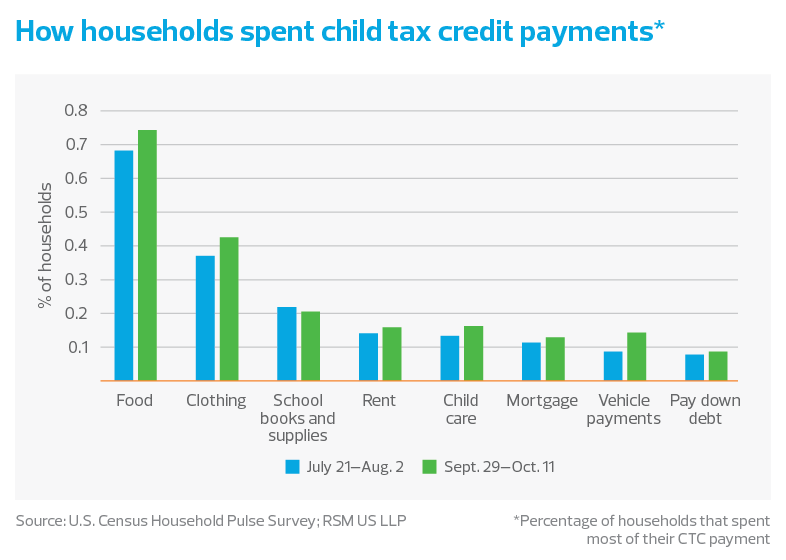 An overwhelming majority of those who received child tax credits applied those funds to food, clothing and school supplies. Smaller percentages of households allocated a portion of their benefits to rent, child care, vehicle payments and debt repayments.