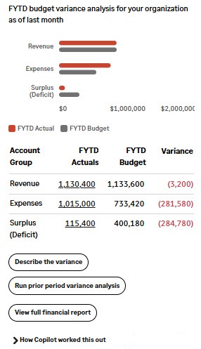 With Sage Copilot, financial teams have greater visibility into the data that drives ongoing success. Team members can access real-time variance analysis by automatically comparing actuals to budgets, enabling the immediate detection of financial discrepancies. Users can also receive up-to-date budget insights through intuitive dashboards, helping leadership make informed evaluations (see Figure 2)